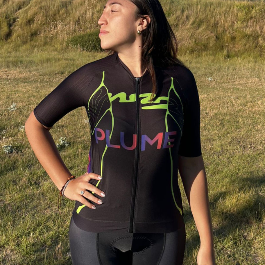 Pensé pour les cyclistes qui veulent affirmer leur présence sur la route ou dans le peloton, il associe esthétique percutante et coupe aérodynamique. Sa matière technique respirante assure confort et maintien, même à haute intensité. Le logo PLUME revisité en dégradé iridescent parachève ce design de caractère.